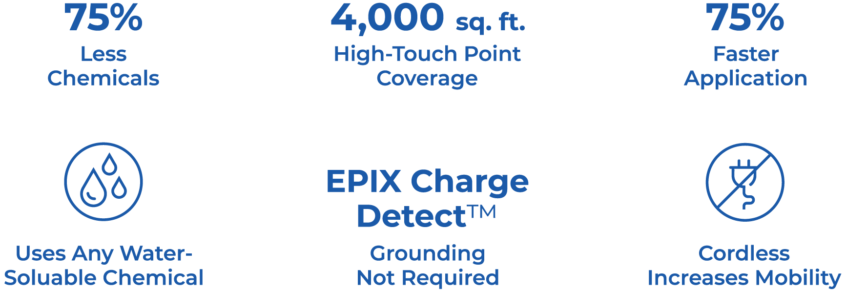 The EPIX360 is the most effective handheld electrostatic disinfectant sprayer in the world. Built to work, this cordless sprayer is powerful, durable, and provides breakthrough application performance – more coverage, less waste, and better results.